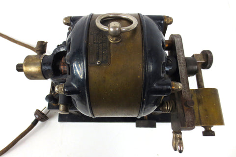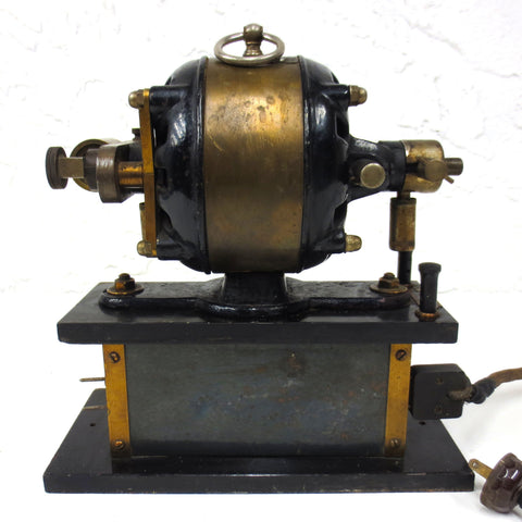 All original and complete, brass and black enameled metal. Medical cautery station dated 1890 and signed Wappler Electro Medical Apparatus, New York. All tags intact and readable, "Cautery"marked on one side near 2 medical instrument connectors. Unit has its original power cord with a 2 pin plug, connects to a standard A type electrical outlet. Device powers up however calibration and motor servicing will be required for unit to be operational. Bottom of unit has a 1 5/8" diameter and 7 1/2" long cylindrical space and a sturdy nickel plated handle on top. Specification: Bottom section 115V, top motor 110V A.C., 4 Amps, 60 Cycles. Station weighs 21 pounds and measures. 10 X 6 1/2 X 10 1/2 inches.